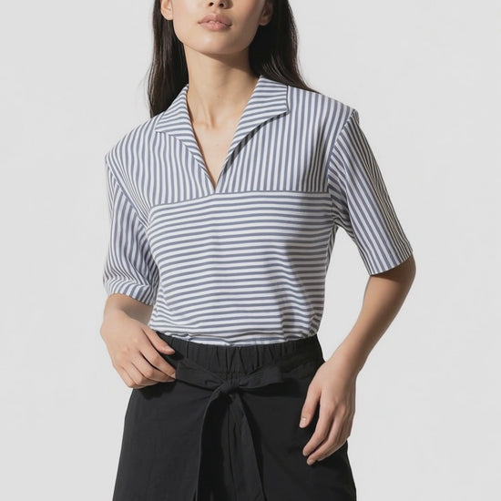 ボタンのないスキッパーカラーが、デコルテラインをすっきりと美しく見せます。